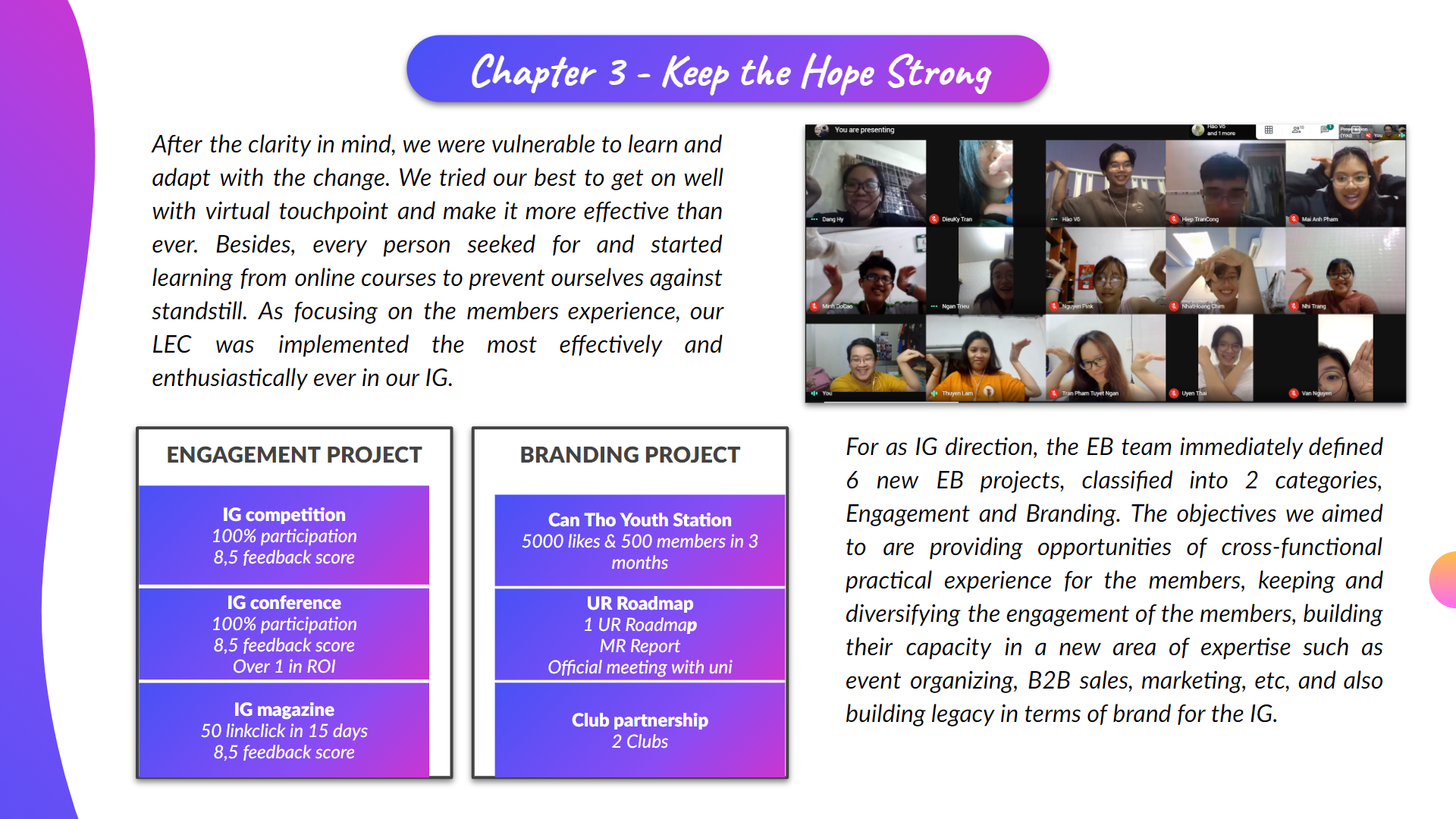 Đây là chướng ngại “khó đỡ” nhất trong năm qua. Không thể nào ngờ được hành trình IGP của mình lại có sự góp mặt của nhân vật này. Mọi thứ ập đến ngay lập tức và toàn bộ cục diện thay đổi liên tục. Tất cả hoạt động exchange tạm dừng, những điểm chạm của tổ chức chuyển thành nền tảng online, nhiều thành viên lo lắng và nghi ngờ về hành trình phía trước. Tuy nhiên, mình khá tự hào khi EB đã phản ứng nhanh và đưa ra các thay đổi trong kế hoạch hoạt động, kéo tất cả mọi người về quỹ đạo và tiếp tục giữ tinh thần lạc quan. Mặc dù, các dự án trong kế hoạch sau đó không được hoàn thành một cách trọn vẹn cho lắm, nhưng mình vẫn đánh giá đây vẫn là một bước tiến trong việc điều hành IG từ trước đến giờ.